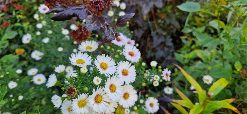 Biała chryzantema świeci pomiędzy kolorami jesieni. Wprowadza na rabacie spokój, gdy dokoła jest mnóstwo przebarwiających się na czerwono i pomarańczowo roślin.