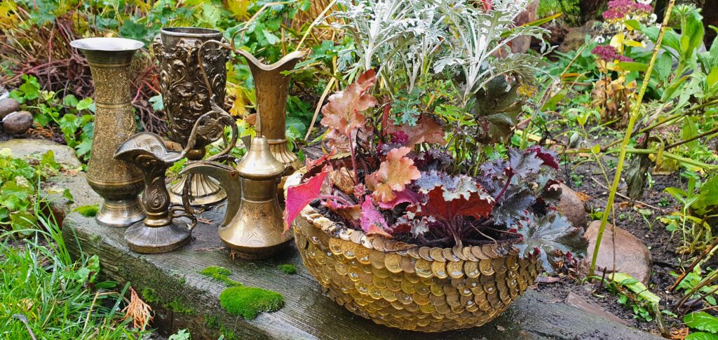 A tu obsadzona żurawkami w wersji jesiennej. Podoba mi się w towarzystwie dzbanuszków..