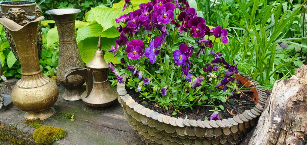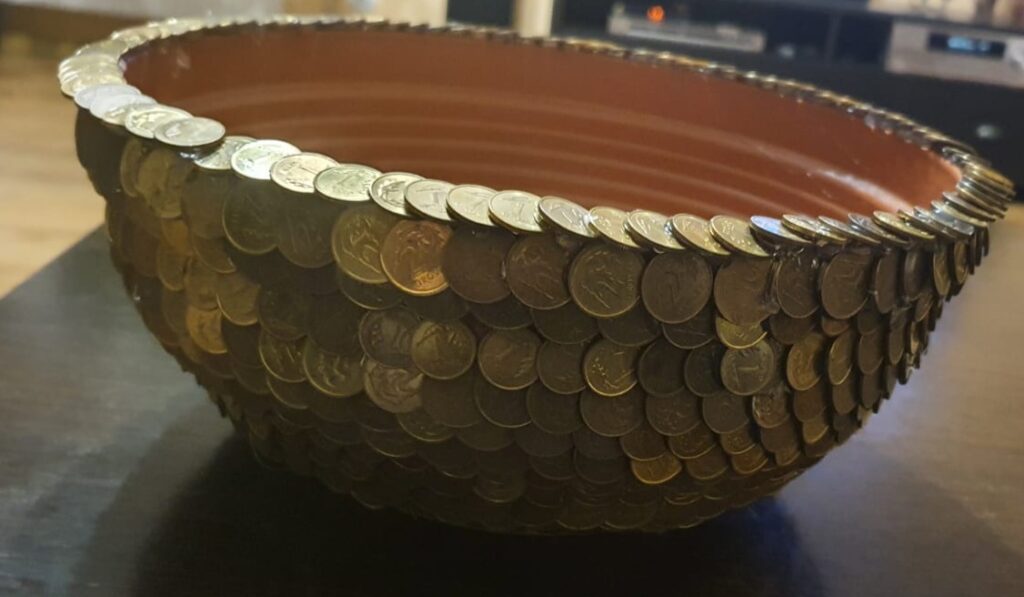 Nazbierało mi się dużo jedno i dwu groszówek. Wykorzystałam plastikową donicę, klej na gorąco, grosik do grosika, wyklejałam sobie takie cudeńko.