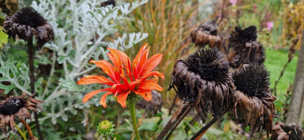 Cały czas sprzątam uschnięte byliny. Jednak nie wszystkie uschnięte byliny wycinam. Uschnięte kwiaty jeżówek będą zdobiły moje rabaty aż do wczesnej wiosny.