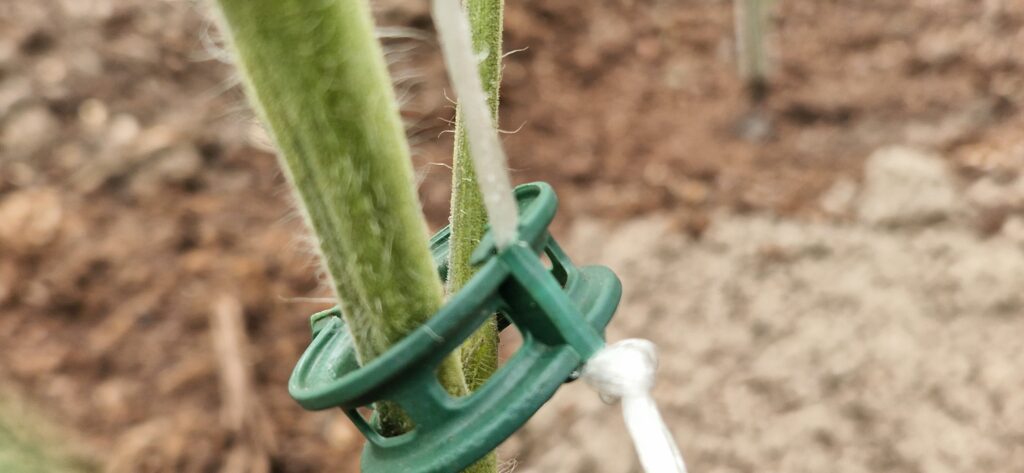 W zależności od wysokości krzaczka pomidorów zakładamy dwie, trzy opaski. Gdy pomidory urosną, można jeszcze dołożyć opaskę jedną lub dwie. W nie wpina się sznurek, który przywiązujemy np. do góry stelażu.
