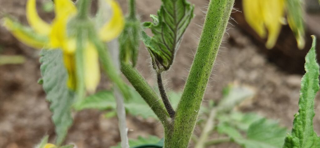 Kolejna czynność jaką teraz robimy, to na bieżąco usuwamy wilki. Są to dzikie pędy wyrastające przy liściach. Pędy te osłabiają roślinę, usuwajmy je na bieżąco. Pomidory prowadzimy na jeden pęd przewodzący. Wtedy rodzą duże owoce. Gdy jednak wytworzą się dwa pędy i nie zauważymy tego w porę, pędy będą za duże do usunięcia, możemy prowadzić na dwa przewodniki.