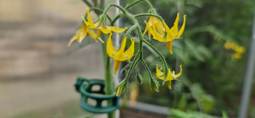 Moje pomidory już kwitną, pomagam im trochę w zapylaniu. Potrząsam delikatnie kwiatostanami, w celu rozpylenia się pyłku kwiatowego.
